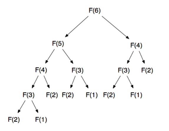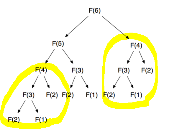 여기서 반복적으로 중복이 일어난 부분이 있다. 원으로 표시한 부분만 아니라 F(4)와 F(3)을 구하기 위해 모두 F(2)를 계산해야한다. 이런 식으로 매번 다 계산을 하면 시간적으로 비효율적이다. 그래서 DP방식을 이용해 메모이제이션을 통해 값을 활용해서 문제를 해결하면 훨씬 빠른 계산이 가능해진다.